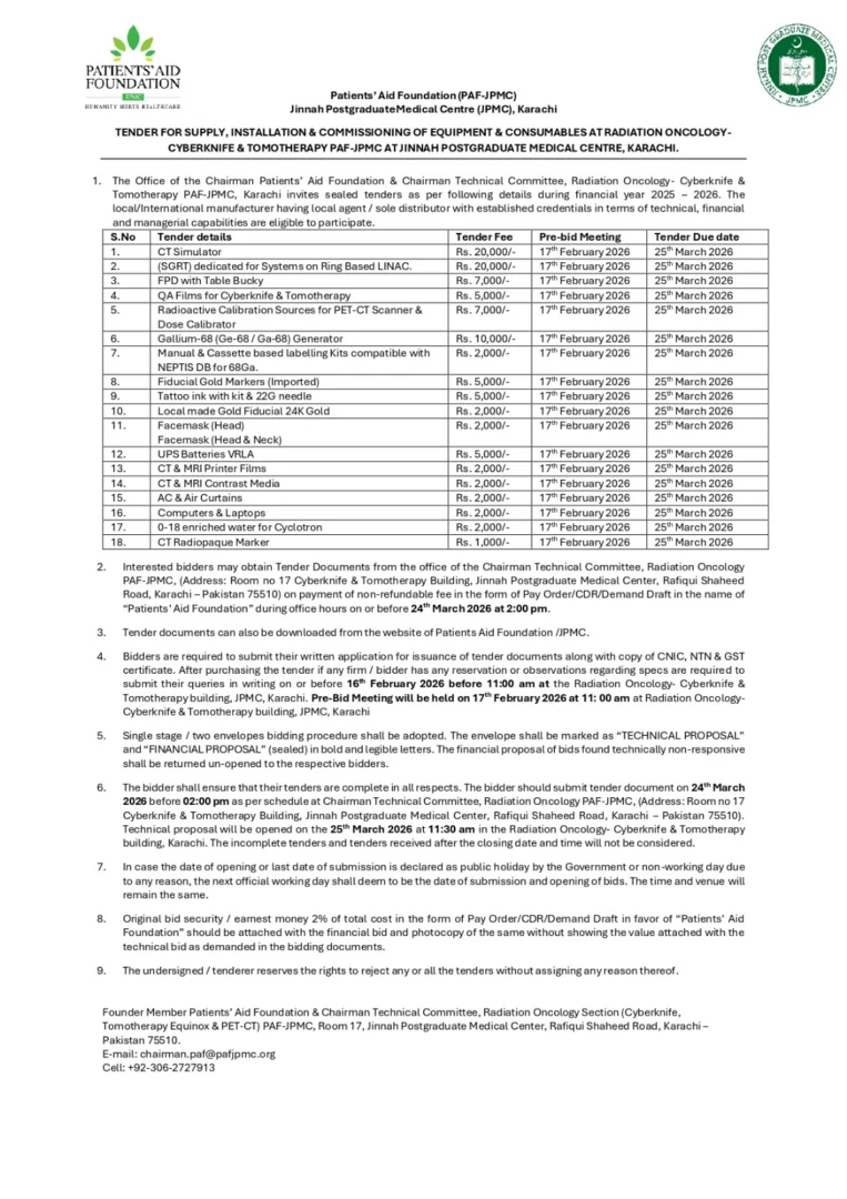 Tender for Supply, Installation, Testing & Commissioning of Equipment at SYMMC and RRSB Employee Ward, JPMC Karachi. Advertised on 18th September 2025 | Submission due by 28th October 2025.